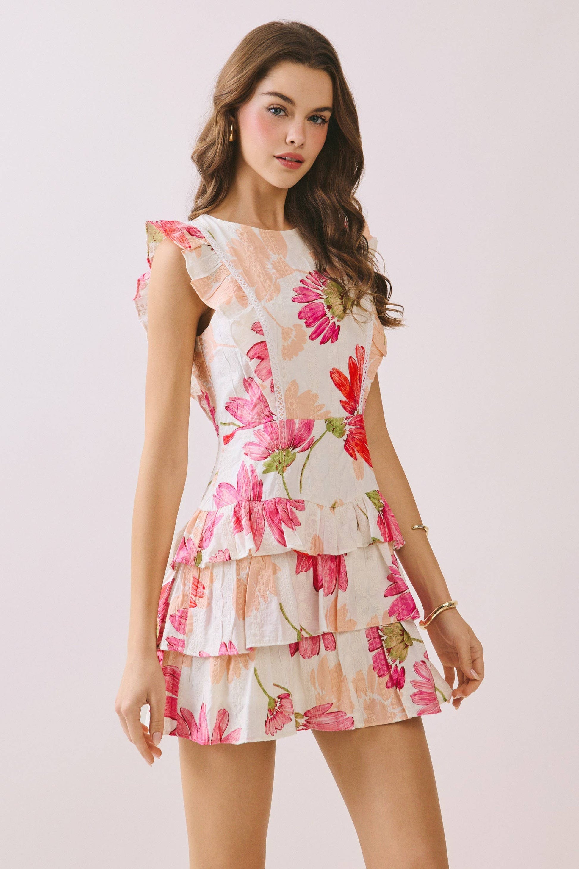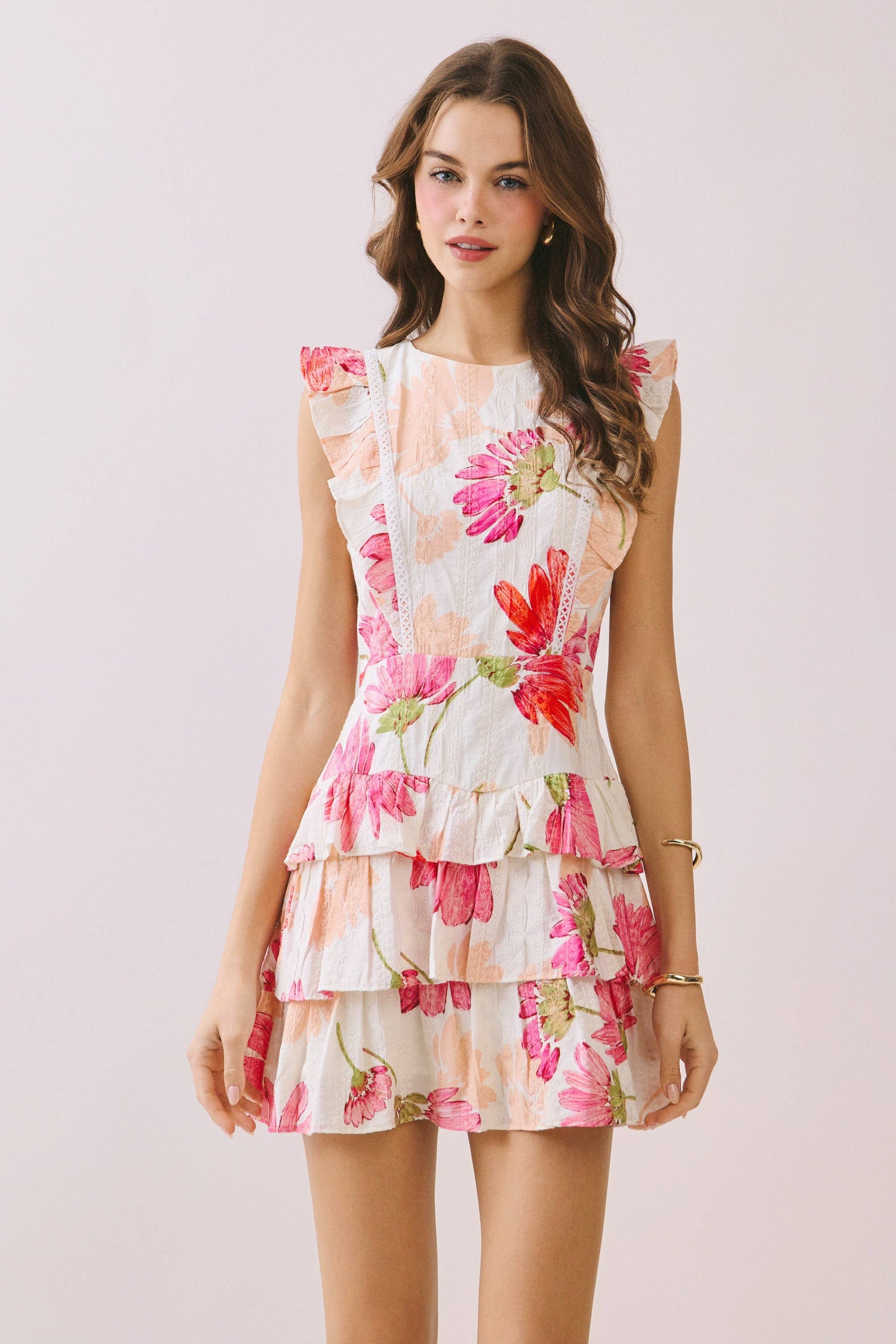 A floral-print mini dress featuring layered ruffle sleeves and a round neckline. Designed with a fitted bodice and multiple tiered ruffle layers. Finished with delicate lace trim accents throughout and a concealed back zipper closure.