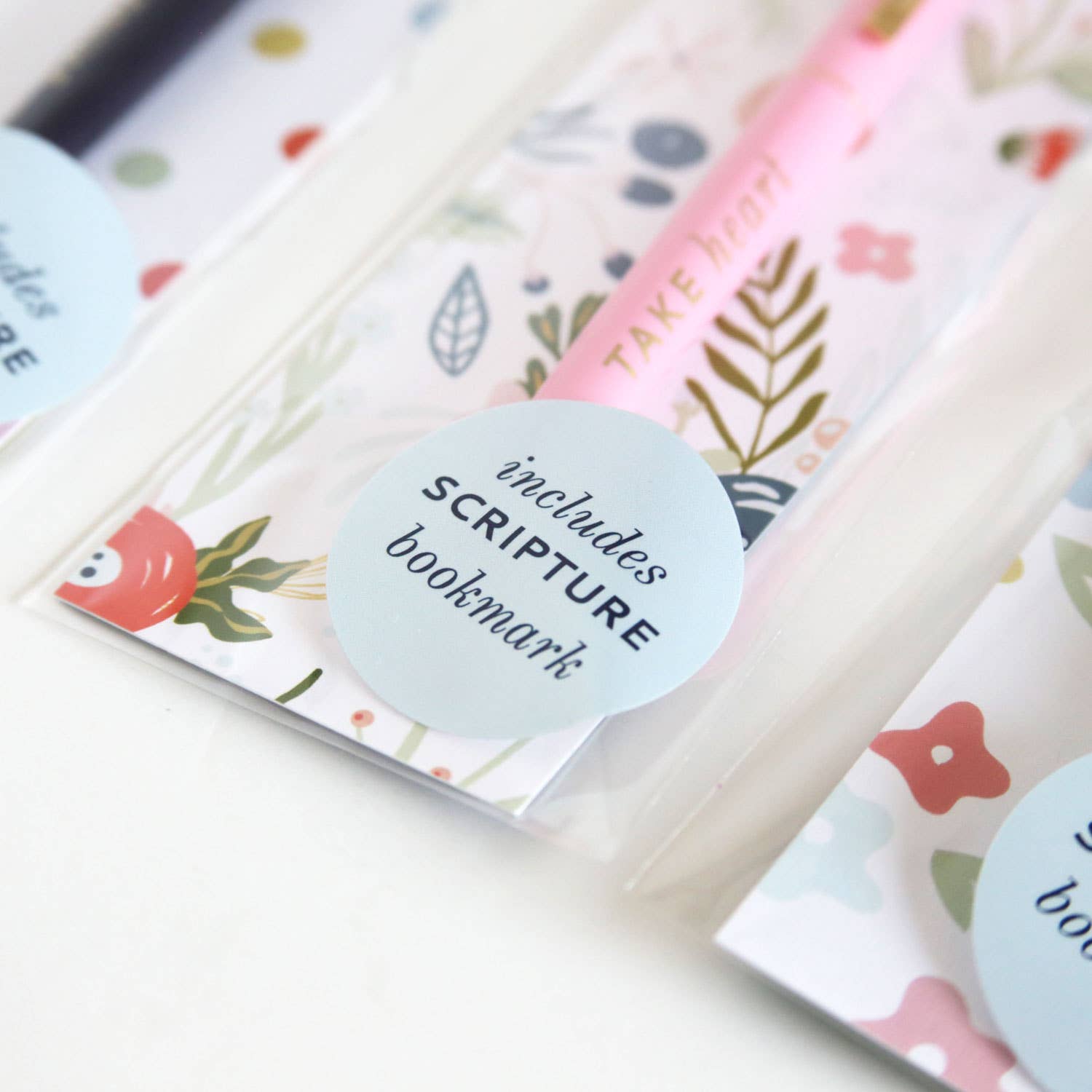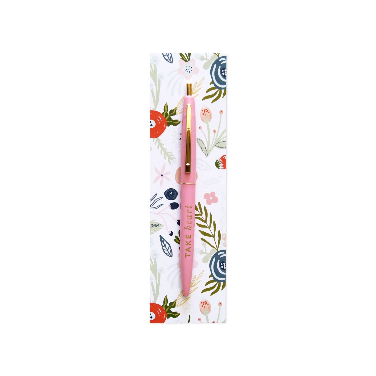 Take Heart. Our classic ballpoint pens are designed to be sweet reminders of truth in the middle of busy days. This simple pink pen features gold details and a pretty floral backer that doubles as a Bible verse bookmark, making it the perfect little gift or happy for the ones who mean the most.
