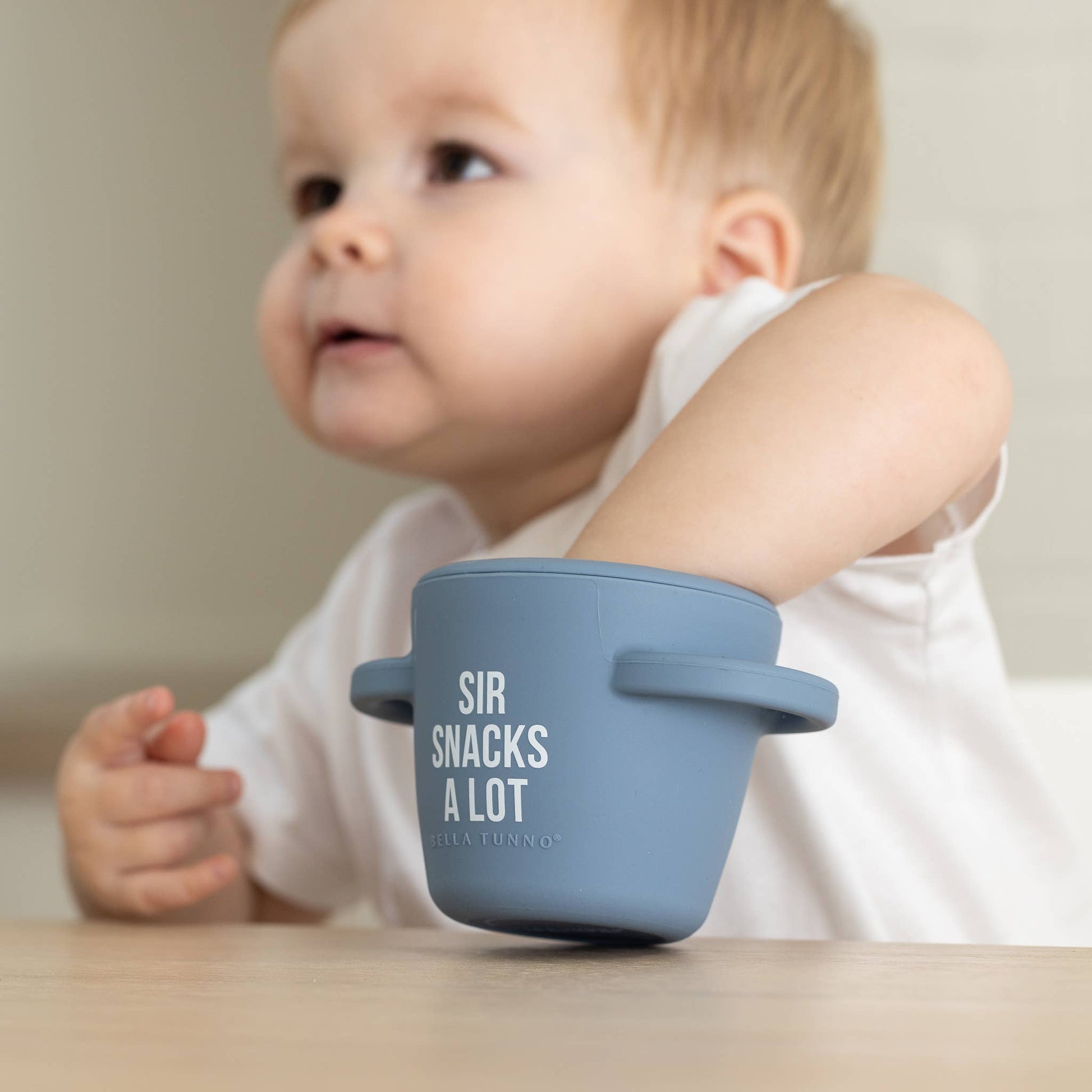 The Happy Snacker is a first-of-its-kind two-piece silicone snack cup with a mess-proof snap-tight lid and soft silicone opening so little hands can easily access food and prevent spills. Designed with easy-grip handles, it fits in car seats and stroller cup holders.